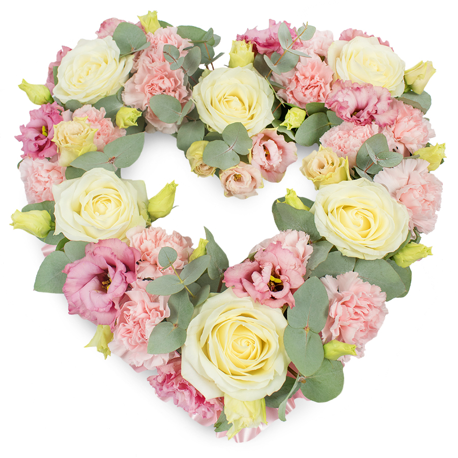 Show your heartfelt appreciation with our beautiful open heart bouquet, designed to convey deep emotions and lasting memories. This stunning arrangement combines white roses, pink carnations, pink lisianthus, and eucalyptus leaves, all selected for their exceptional freshness and beauty.