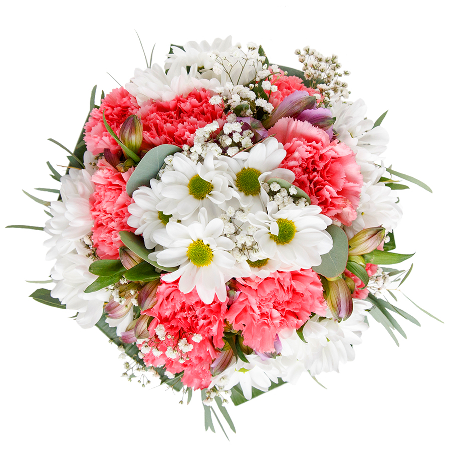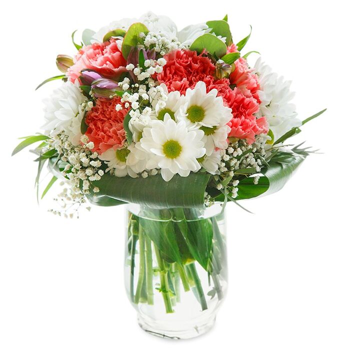 Designed to enchant, this luxurious arrangement blends the gentle hues of white chrysanthemums, airy gypsophila, and soft light pink carnations with the natural elegance of aspidistra leaves. Every detail is meticulously arranged to create a visually stunning display.